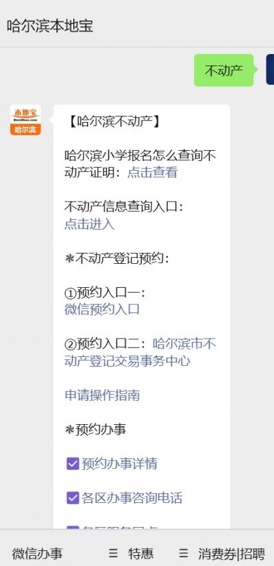 温馨提示:微信搜索公众号【哈尔滨本地宝】,关注后在对话框回复【不动产】可获哈尔滨不动产登记办理指南、线上预约入口、不动产信息查询等